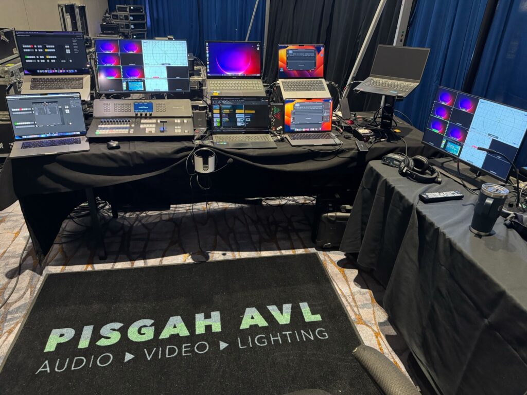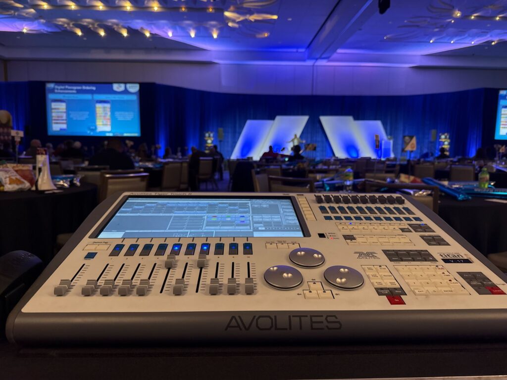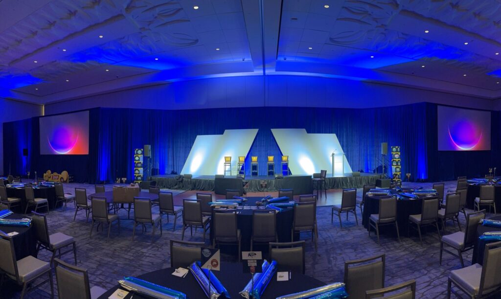 We had a great time supporting this Corporate Meeting. Our team handled everything behind the scenes; audio, video, lighting, blue velvet pipe and drape, and some custom scenic pieces, to help bring the room to life and make the experience feel seamless for everyone attending.